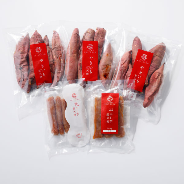 「紅天使」の冷凍焼き芋1.5㎏と冷凍干し芋平干し200g、丸干し200gが入ったセットです。紅天使をたっぷりご堪能いただけます♪