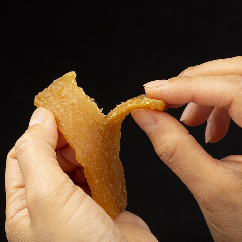 干し芋の定番といえば、蒸したさつまいもをスライスして乾燥させた「平干し」です。オーブントースター等で少し加熱すると、グッと甘みが増し、焦げ目がつくまで加熱したり、その上にバターなどを乗せてみたりと、食べ方もさまざま楽しめます。
