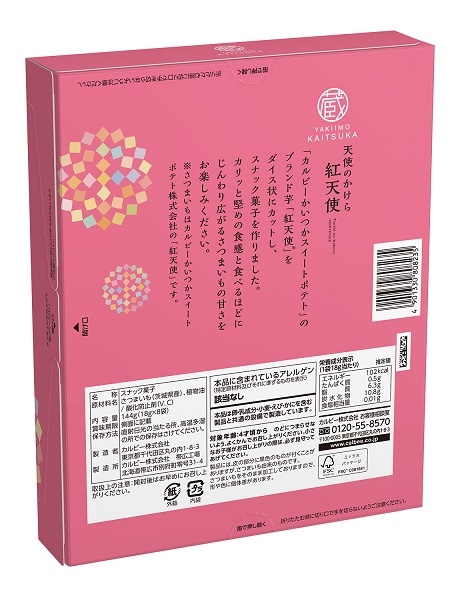 名称 スナック菓子 原材料名 さつまいも(茨城県産)、植物油/酸化防止剤(V.C) 内容量 144g(18g×8袋) 賞味期限 製造日より4か月 保存方法 直射日光の当たる所、高温多湿の所での保存はさけてください。 栄養成分表示(100gあたり) エネルギー102kcal、たんぱく質0.5g、脂質6.3g、炭水化物10.8g、食塩相当量0.01g