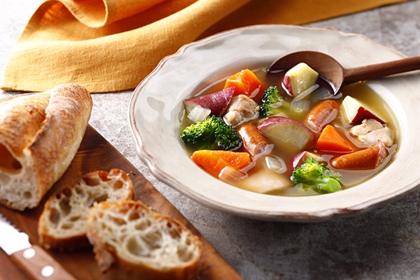 4. 鍋にコンソメスープを作り、ブロッコリー以外の具材を入れて柔らかくなるまで煮込み、塩・胡椒で味を調える。